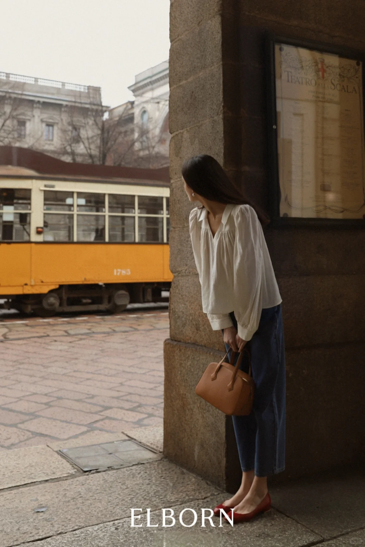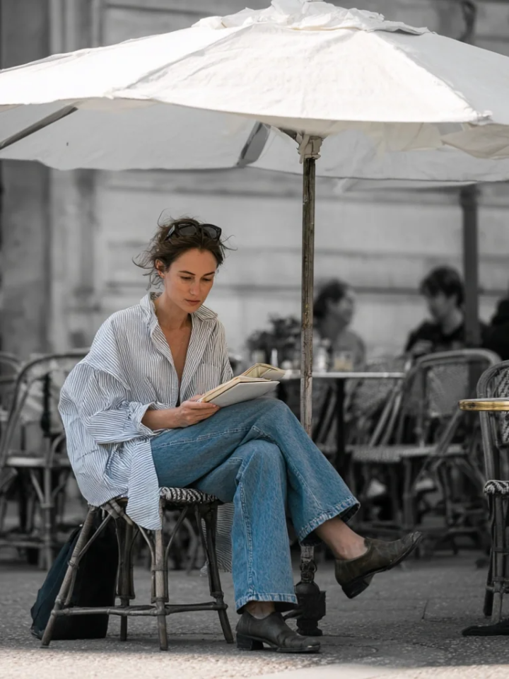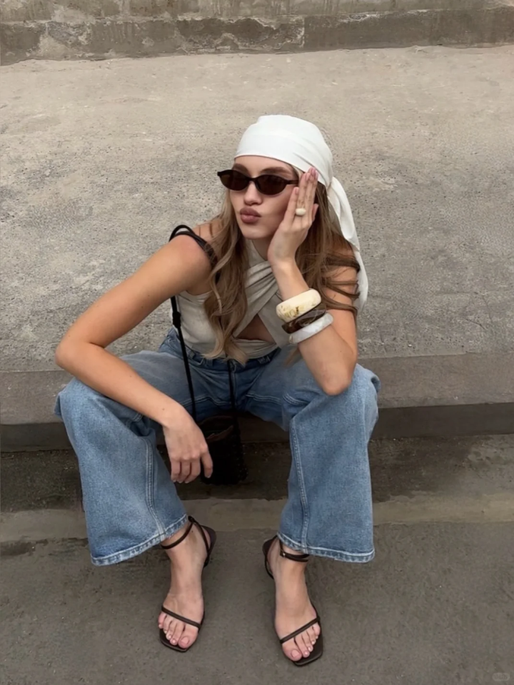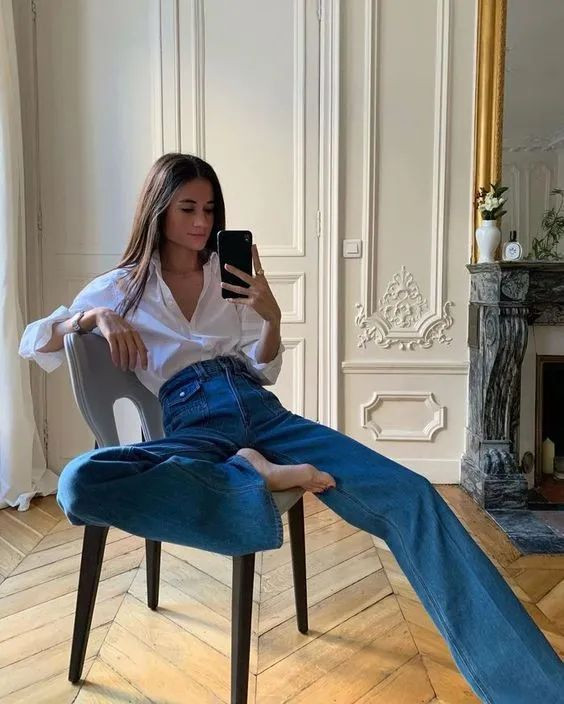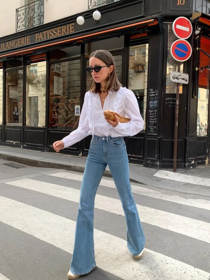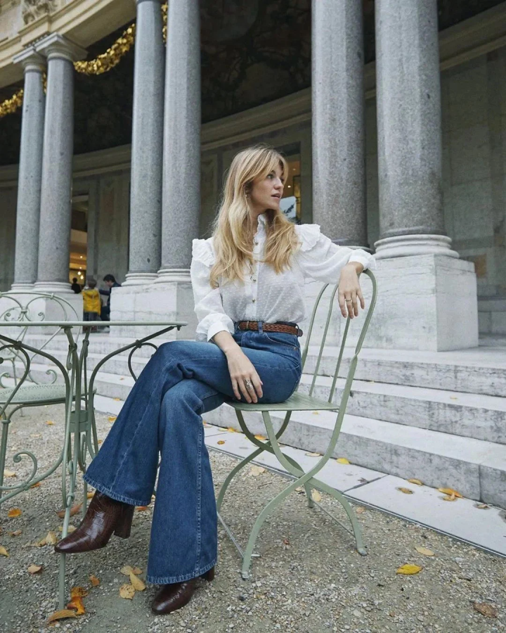 牛仔裤凭借复古微喇裤型,既能延续喇叭裤 “显高优化比例” 的优势,又以浅蓝色调贴合初秋的清爽氛围,与白衬衫形成 “清爽 + 复古” 的奇妙化学反应,不违和且有记忆点。