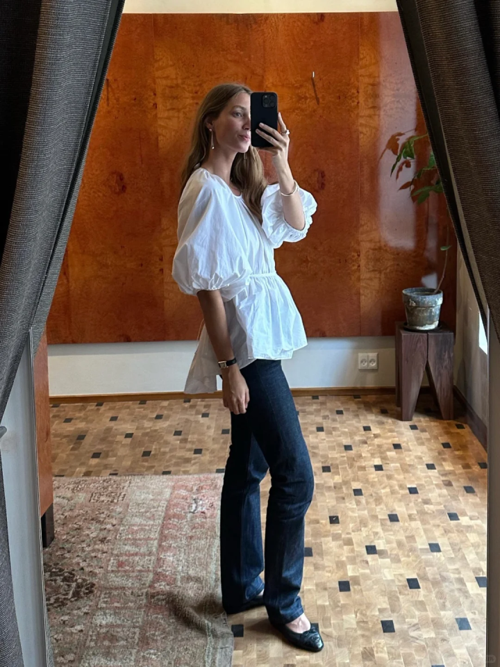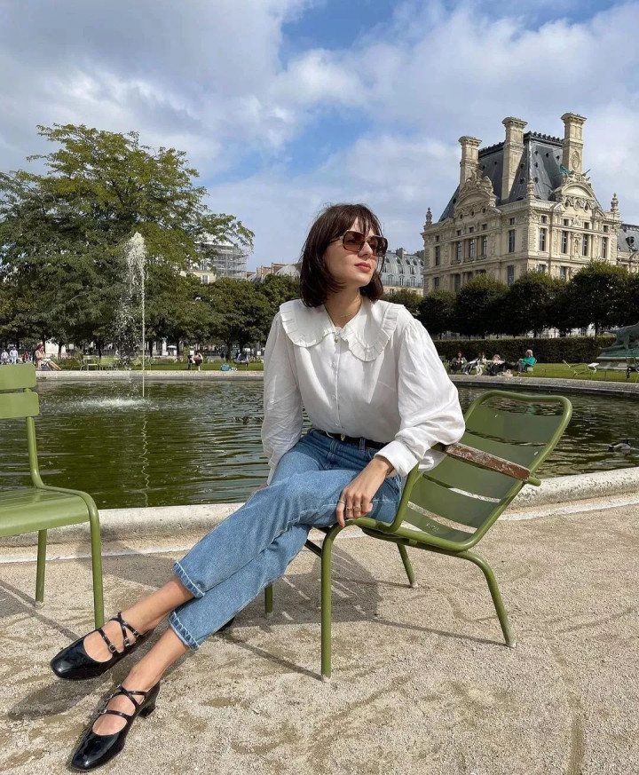 白色娃娃领衬衫搭配九分牛仔裤,娃娃领的软萌中和了牛仔裤的休闲,九分裤露踝的利落衔接玛丽珍鞋的精致,甜而不腻,时髦又显元气。