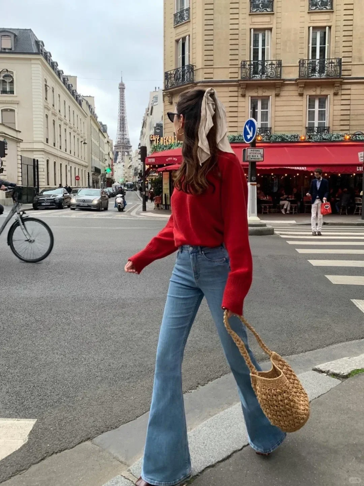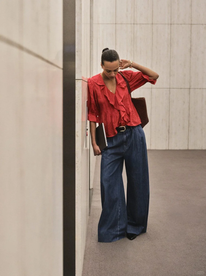 红色荷叶边衬衫搭配亮蓝色牛仔阔腿,以 “高饱和撞色” 为核心亮点,既保留了牛仔的随性,又用红色衬衫和精致配饰注入优雅感,整体平衡了活力与利落。
