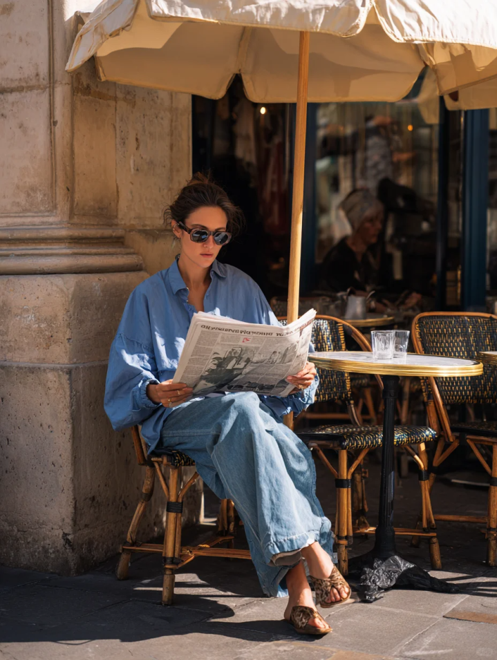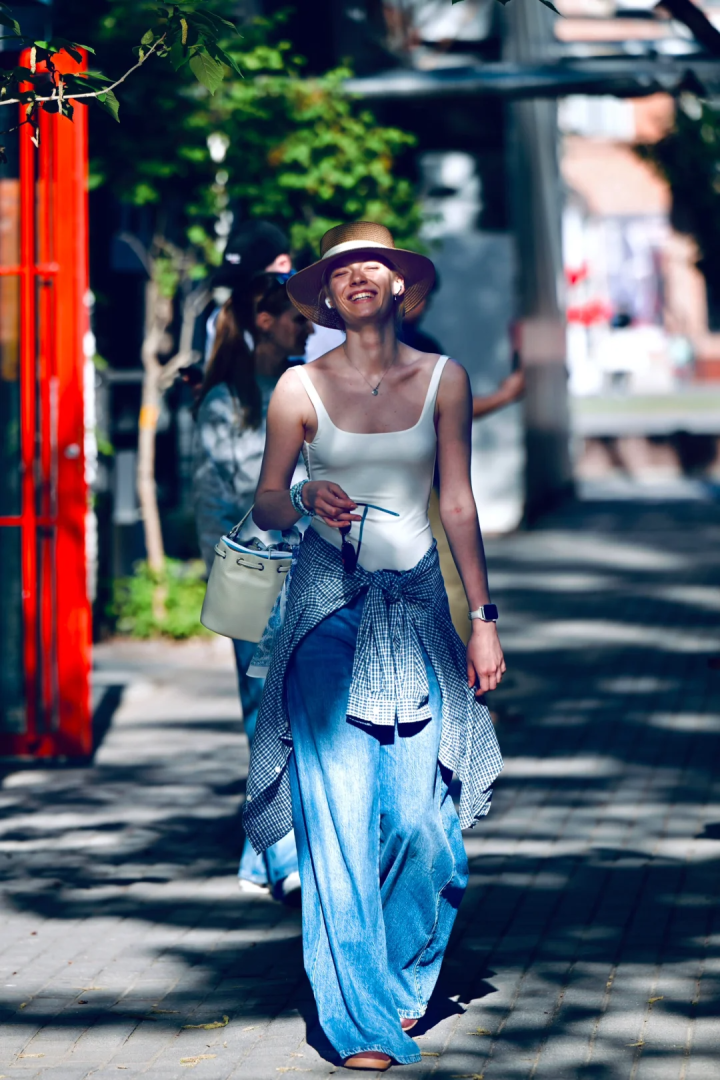 阔腿廓形自带随性慵懒气质,牛仔材质又保留利落感,无需复杂搭配就能撑起造型,契合初秋 “不费力时髦” 的穿搭需求。