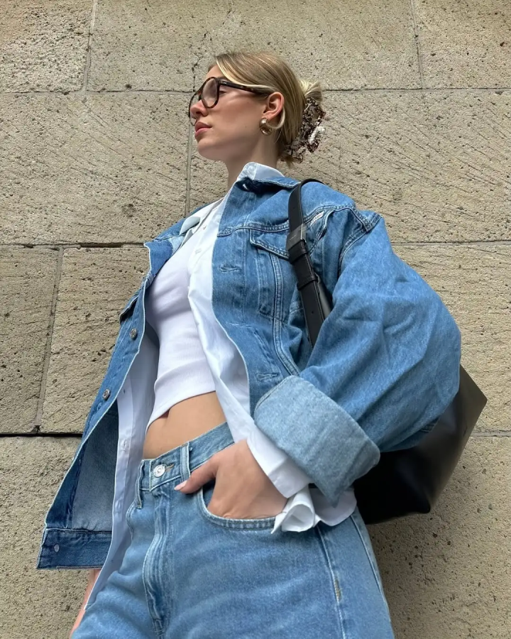 宽松牛仔外套配阔腿牛仔裤,内搭简约白衬衫 + 短款白色上衣的叠穿,既用白衬衫的正式感中和了牛仔套装的休闲感,又通过短上衣露腹设计打破全白内搭的单调,增加露肤度的同时凸显腰线,避免宽松外套 + 阔腿裤可能出现的 “显臃肿” 问题。