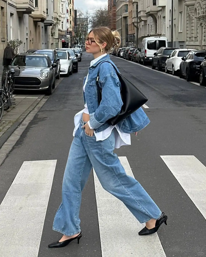 宽松牛仔外套与阔腿牛仔裤形成 “同材质 + 宽松廓形” 的呼应,强化复古氛围;外套的利落剪裁又能收束内搭和下装的宽松感,让整体造型松而不垮。