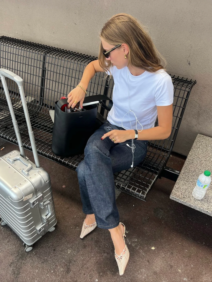 九分牛仔裤搭配白色背心,再外搭一件宽松夹克,最后踩上尖头高跟鞋,整体既有女性的精致感,又不失利落气场,通勤、约会穿都合适。